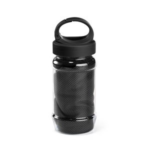 Sporthandtuch aus Polyamid und Polyester mit Flasche (440 mL) aus PP und PET und einem integrierten Karabinerhaken am Deckel - Egotier 99967 - Schwarz